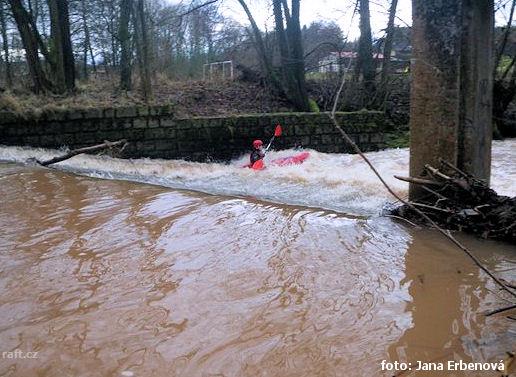 17,2 km Bělá lávka k fotbalovému hřišti od velké vody zatarasena klacky, začíná klidná voda před jez ...