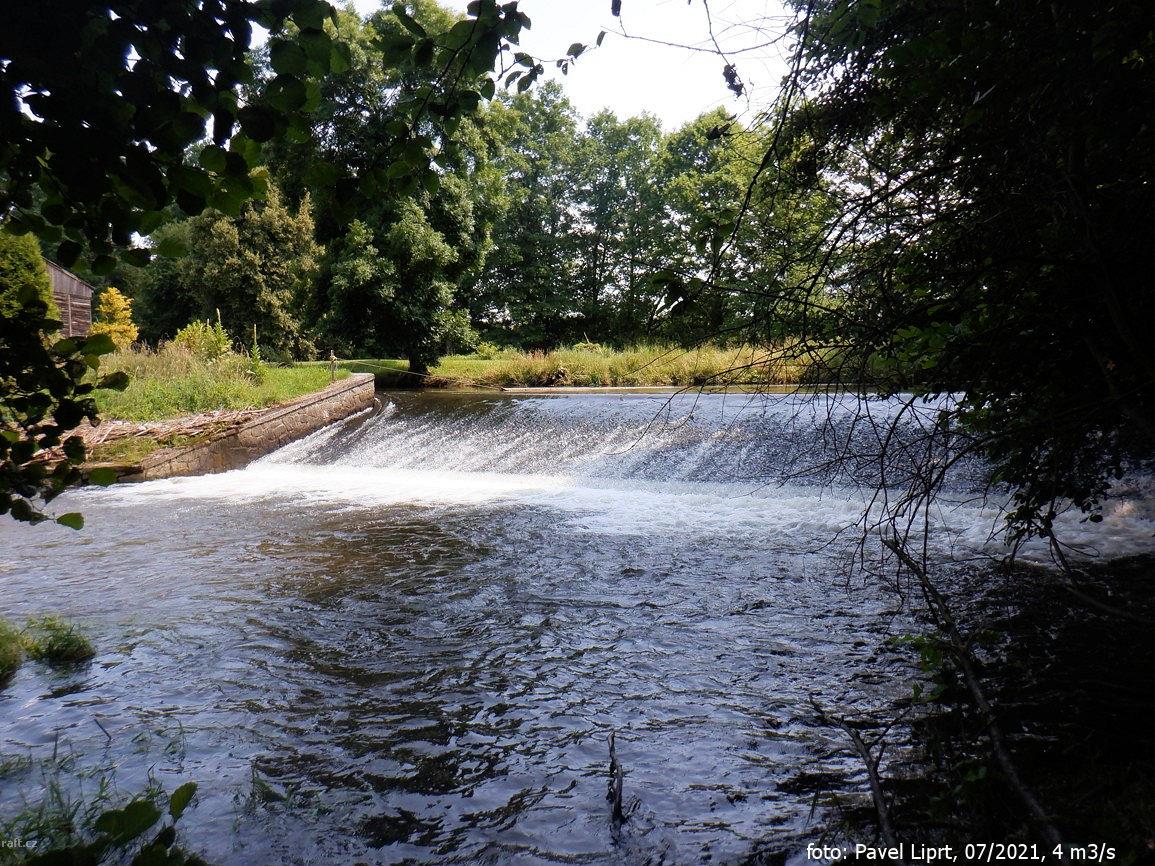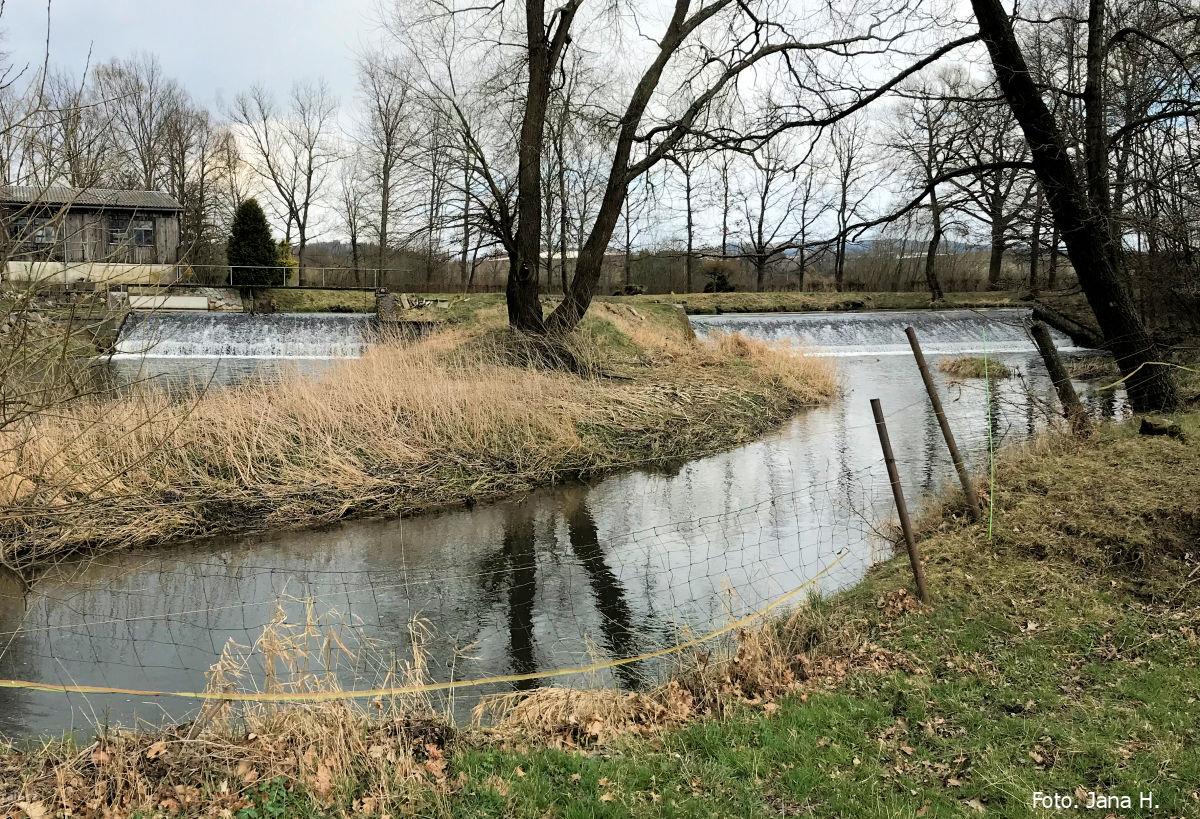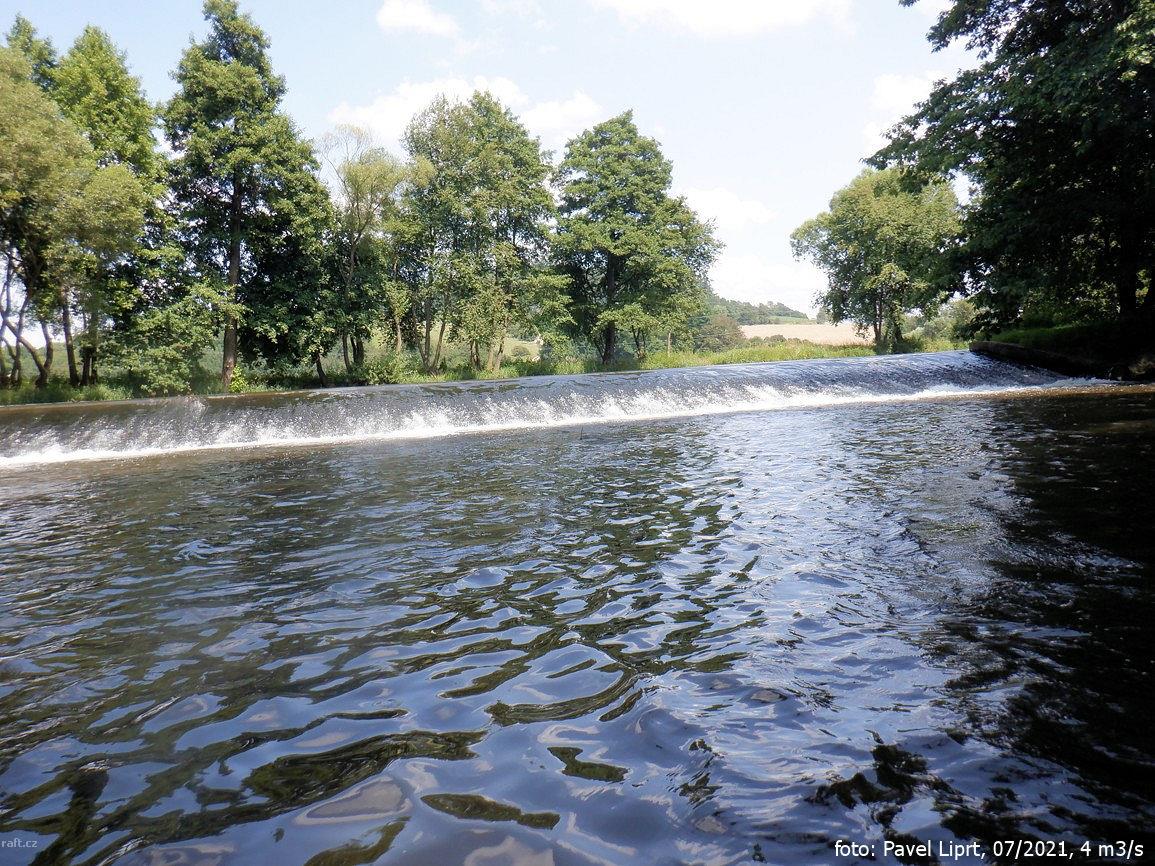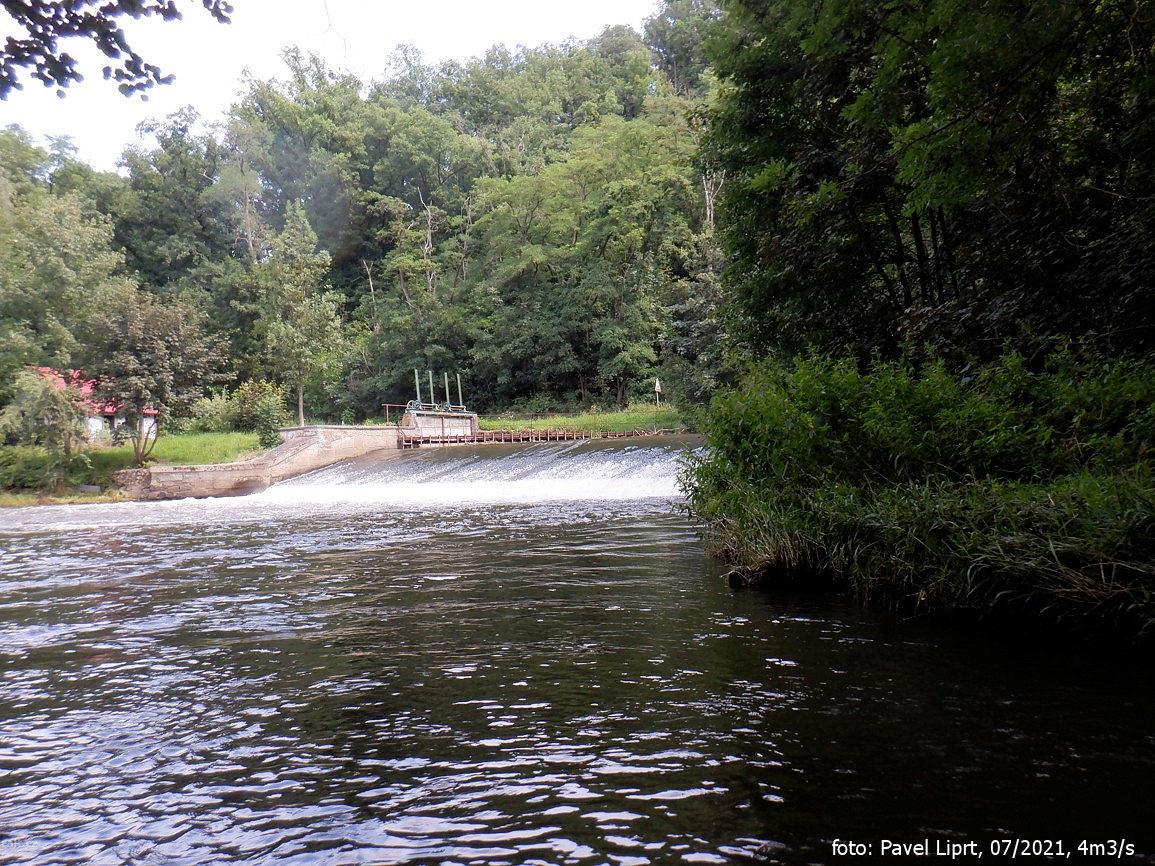 r.km 68,0 Poborovice - jez 22.3.2020, MZP= 1,02 m3/s, spád jezu je 1,95 m