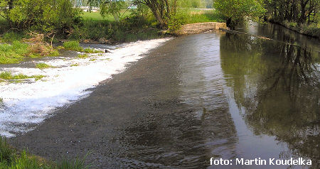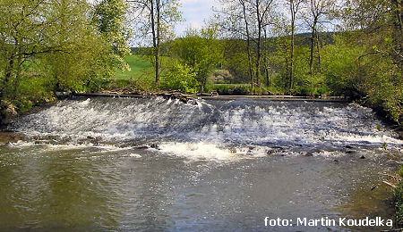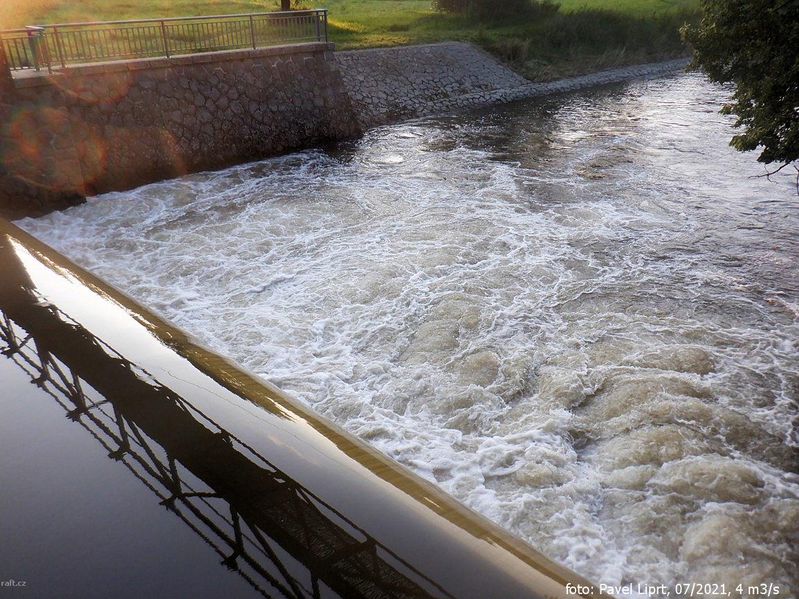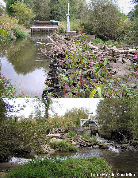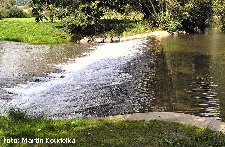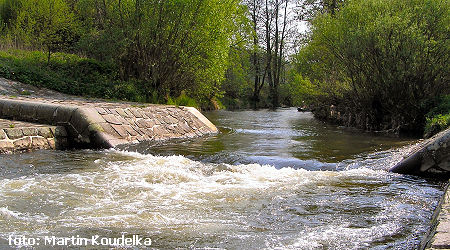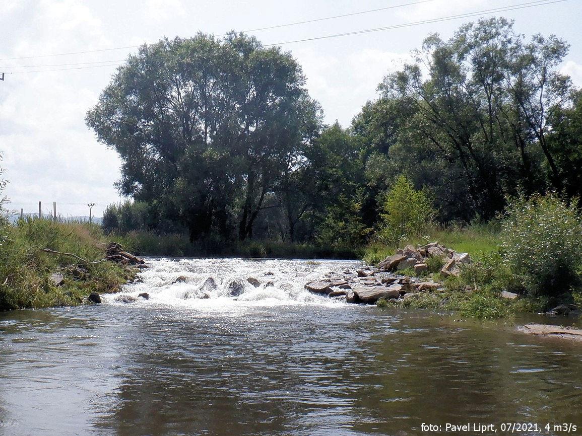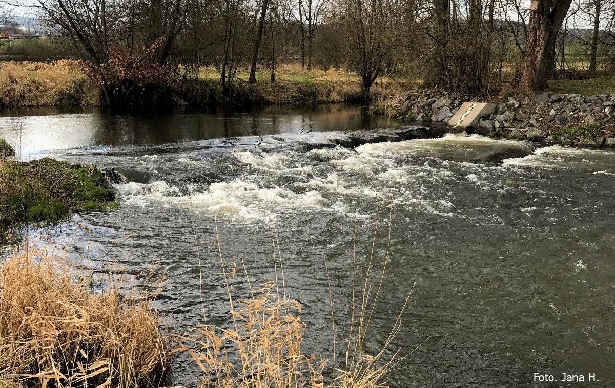 r.km 68,0 Poborovice - jez 22.3.2020, MZP= 1,02 m3/s, spád jezu je 1,95 m