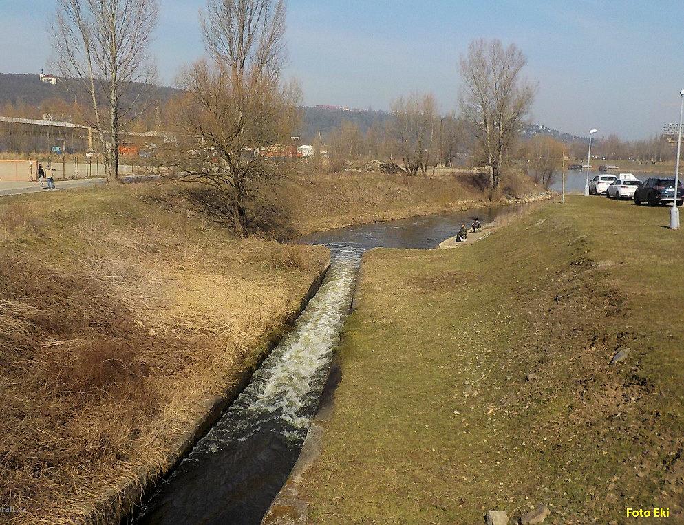 V Praze pod Šítkovským jezem těsně vedle Dětského ostrova, jak je chodníček a jetelné místo, trčí z ...