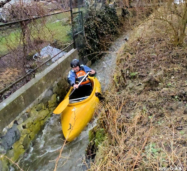 Obtížně se soukáme do přes zimu sraženého hydra a už nasedáme pod hrází Otínského rybníka. Ze začátku si užíváme meandrů v divočině. Zakrátko však vjíždíme do vsi a čeká nás několikeré přenášení nízkých mostků, tunýlků, stavidýlek, trubek a ploty zataraseného koryta. Najdou se i pěkná peřejnatá či úzká místa, jen zastavení v úzkém korytě je obtížné. Ze začátku se snažím otočit loď proti proudu a zastavit, ale po několika zaseknutí napříč potokem raději volím ladné vyskočení do koryta.