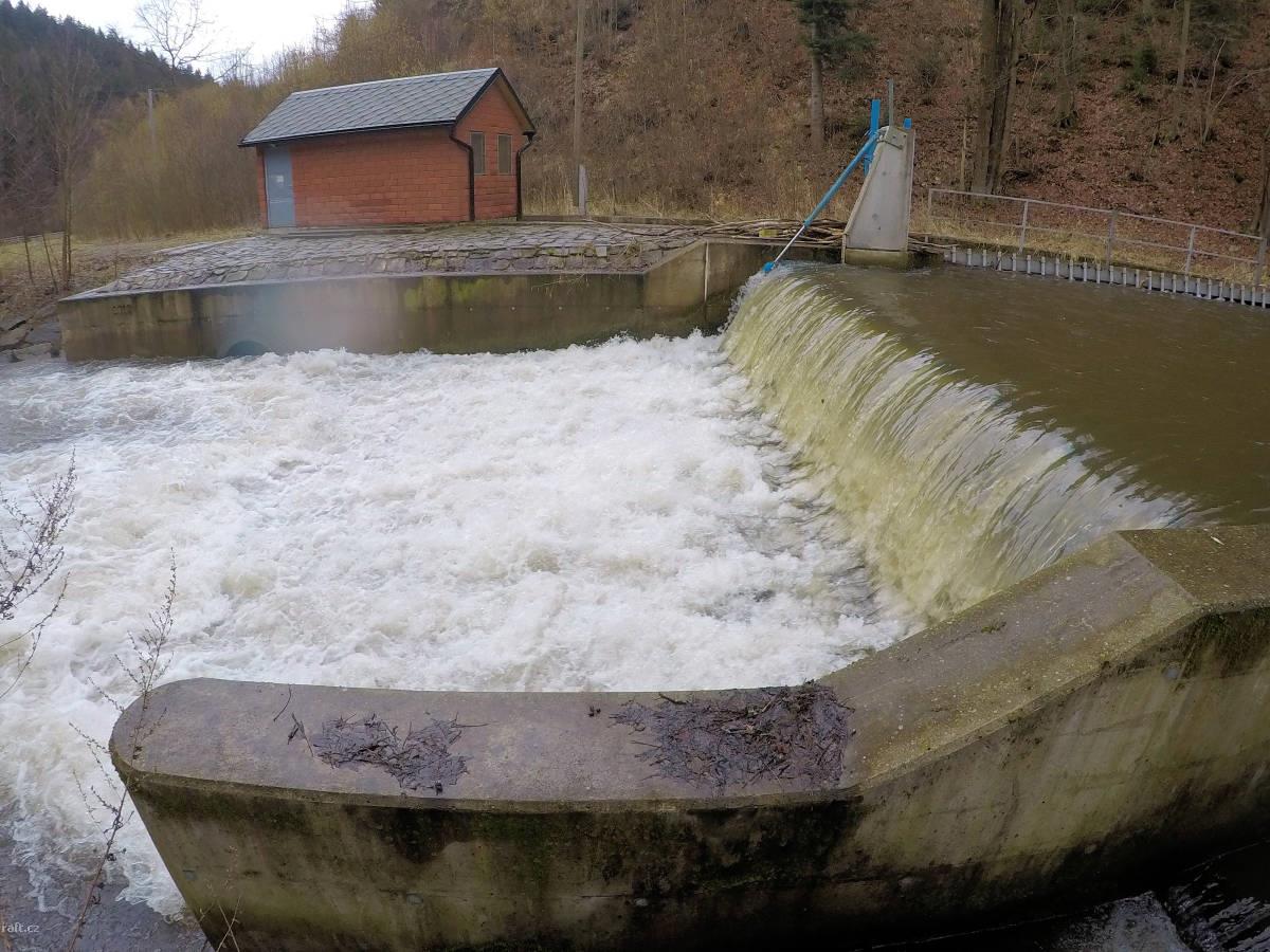 jez Bohdíkov, na koruně jezu je nově klapka, vpravo náhon do MVE a pod ním rybí přechod už poměrně b ...